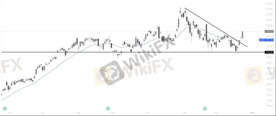 NVIDIA 在有效突破此前的下降趋势压力线后,股价反弹明显加速,短线动能快速回暖。技术结构上,突破伴随重新站稳 EMA,意味着前期整理阶段结束,空方压制被打破,趋势由修复转向主动上攻。只要价格维持在突破位之上,回踩不破压力线反抽区间,行情大概率由技术性反弹演变为趋势延续,上方将重新指向前高与历史高位区间,整体仍体现出AI核心龙头的强势特征。