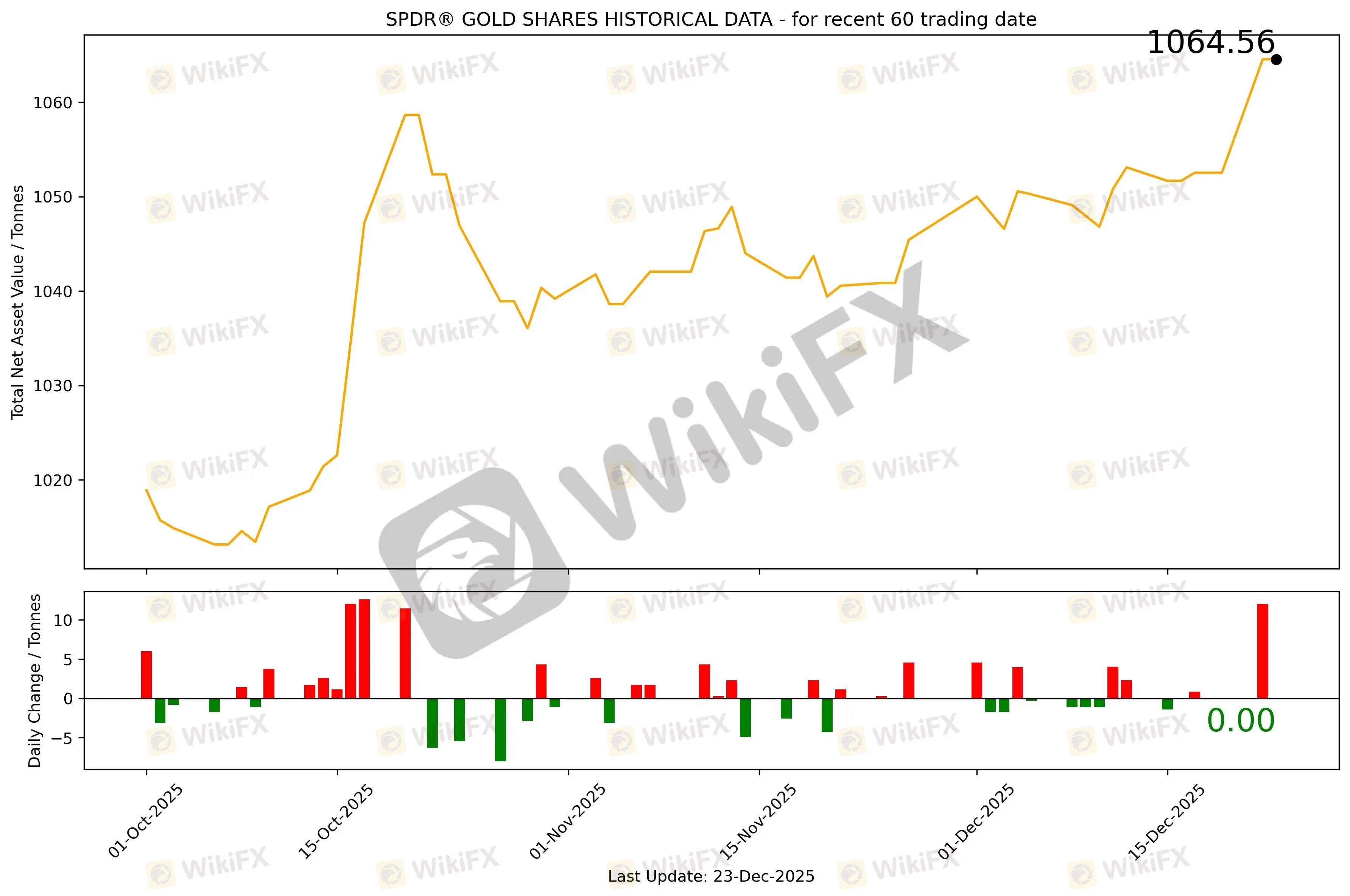 截至12月23日,全球最大的黄金ETF SPDR Gold Trust持仓量为1064.56吨,与上一个交易日保持不变。12月23日现货黄金自4443.21美元/盎司开盘后逐步上行至4500美元关口附近,上破受阻后回踩4470美元一线获得支撑;美盘交易时间先跌后涨,最低向下触及4430.64美元/盎司,最终收于4483.98美元/盎司,涨40.02美元或0.9%。