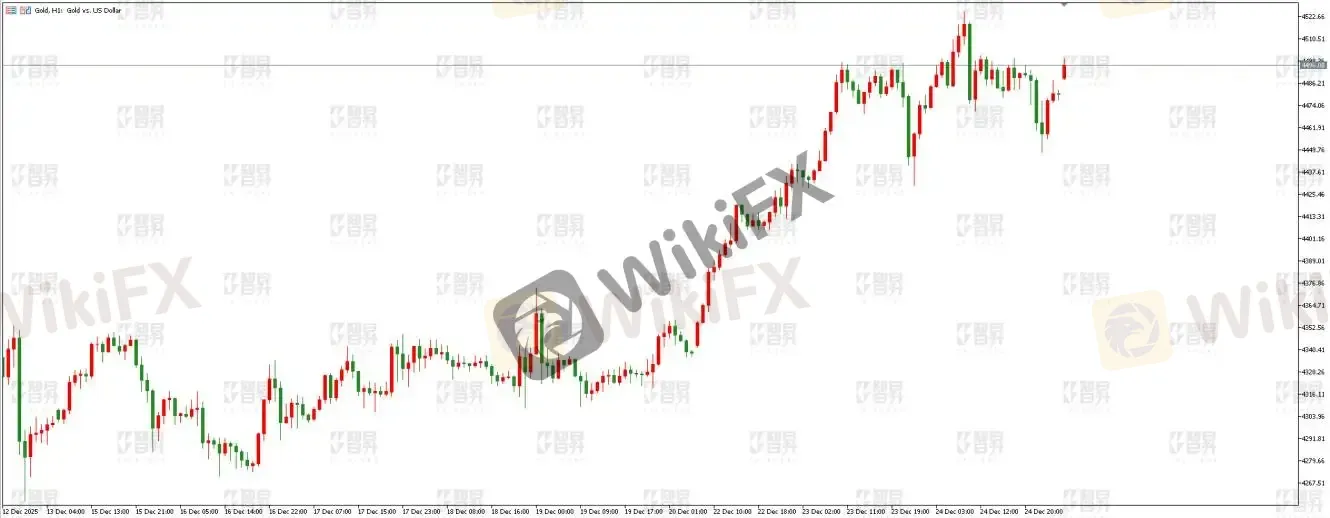 摘要:黄金小时图黄金方面:上周黄金不断刷新历史新高,年度最大涨幅约71%,成为今年表现最好的资产之一,上涨趋势很可能会延续,牛市不言顶。货币政策预期宽松化已经成为市场共识,美国11月失业率已经攀升至4.6%,而CPI价格重回“2”时代,意味着美联储有降息的动力以及降息的空间,市场对2026年上半年降息的定价概率从月初的52%升至78%,宽松预期持续发酵推动实际利率下行。智昇研究市场策略师鹏程认为,美元走