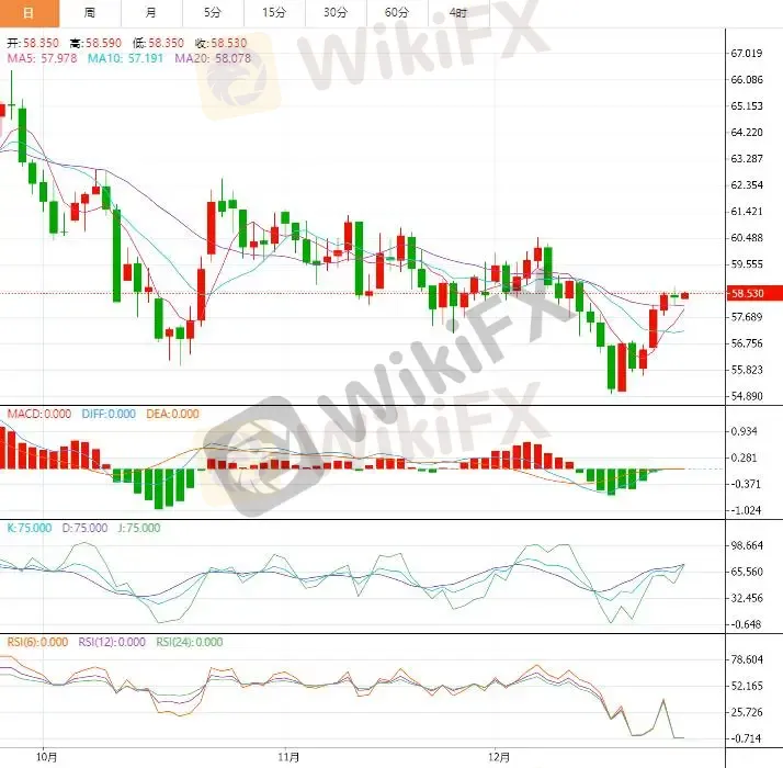 从技术面来看,美原油日线级别仍处于明确的下降趋势中。价格运行在中长期均线下方,5 日、10 日及 20 日均线呈空头排列,对油价构成持续压制。此前跌破 60 美元/桶关键心理关口后,WTI 未能有效收复,显示下方买盘承接力度有限。技术指标方面,日线 RSI 长期徘徊在 40 以下,虽未明显进入极端超卖区间,但反映出市场动能偏弱;MACD 指标运行于零轴下方,绿柱维持放大,空头趋势尚未出现实质性扭转信号。整体而言,在未重新站稳 60 — 62 美元区间之前,WTI 原油仍以震荡偏弱走势为主,反弹更可能被视为技术性修复而非趋势反转。