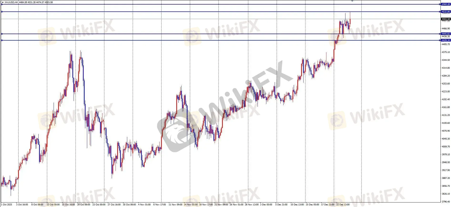 摘要:XAU/USD 黄金昨日回顾与 ETO Markets 观点周三,黄金亚盘延续涨势并创历史新高,于 4525 附近受阻后快速回落,H1 周期形成看跌吞没形态。欧美盘震荡下行,最低触及 4448 后企稳回升,全日波动约 775 点,日线收十字阴星。今日早盘跳空高开,短暂冲高至 4532 后回落。4 小时线实体有所突破,整体仍偏多,但连续两次冲高回落显示高位有获利了结迹象。今日逢周五,需警惕行情冲高回