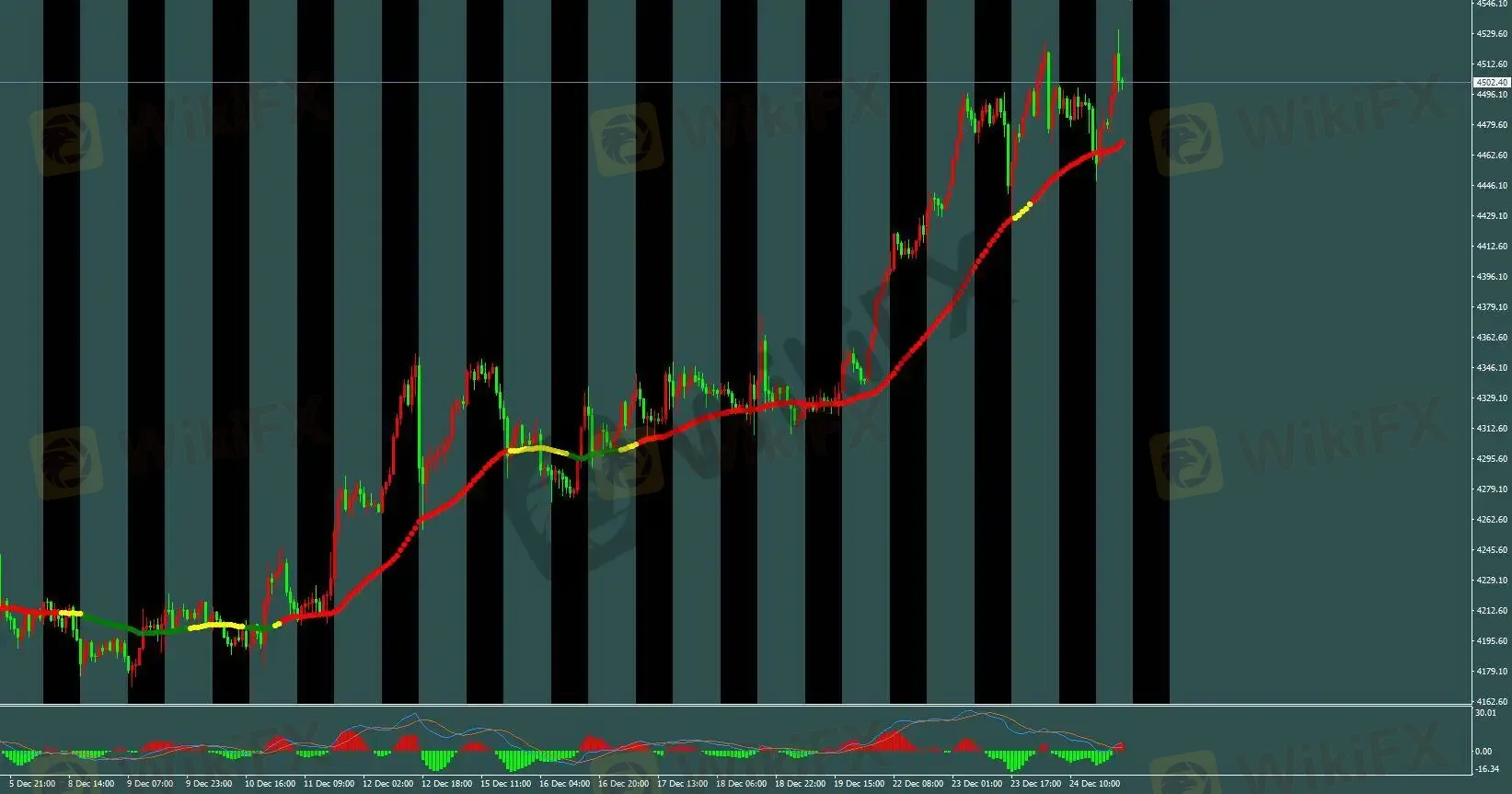 H1 三色线已由黄转红,标准多单已于 4307 入场并盈利 150 点离场。今日建议依据 M5 基础运用模型进行短线交易。