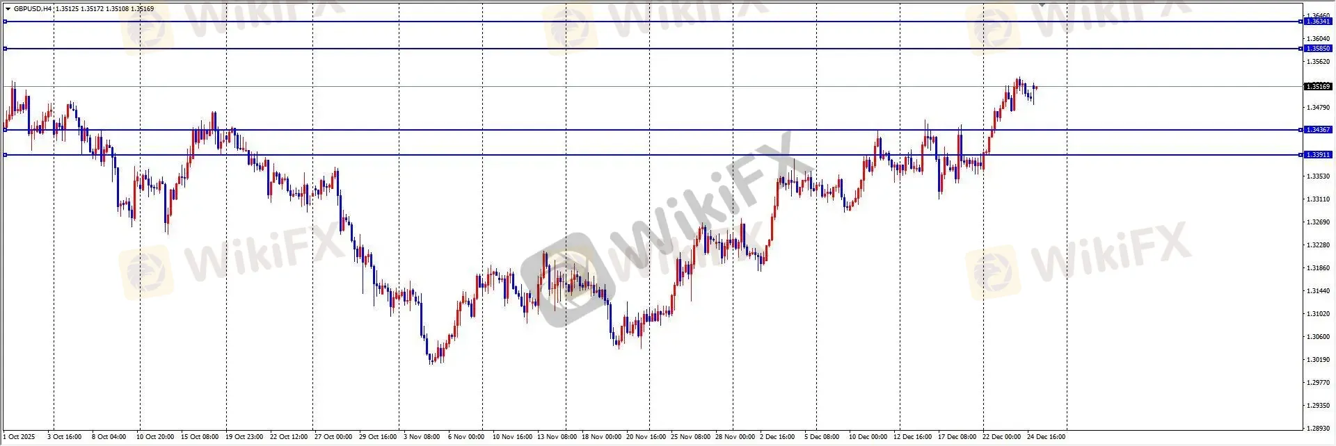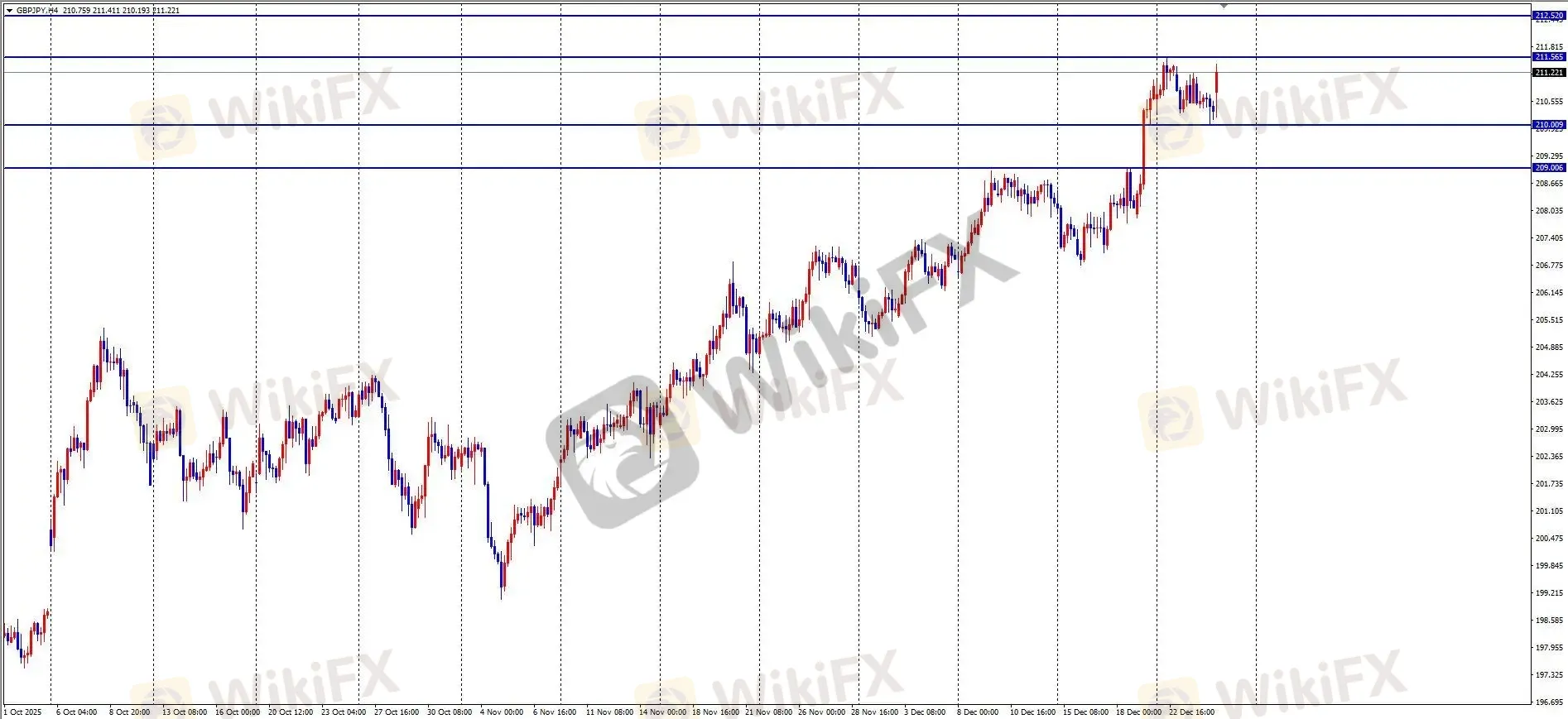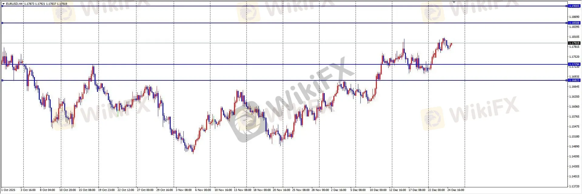 周三欧元区消息面对欧元构成潜在支撑,市场认为官方需求可能在未来数月增强。美国初请失业金人数降至 21.4 万,但就业市场整体仍显低迷。汇价冲高至 1.1807 后回落,全日波动约 35 点,日线收小阴线。整体因临近圣诞假期,市场交投清淡,维持高位震荡格局。