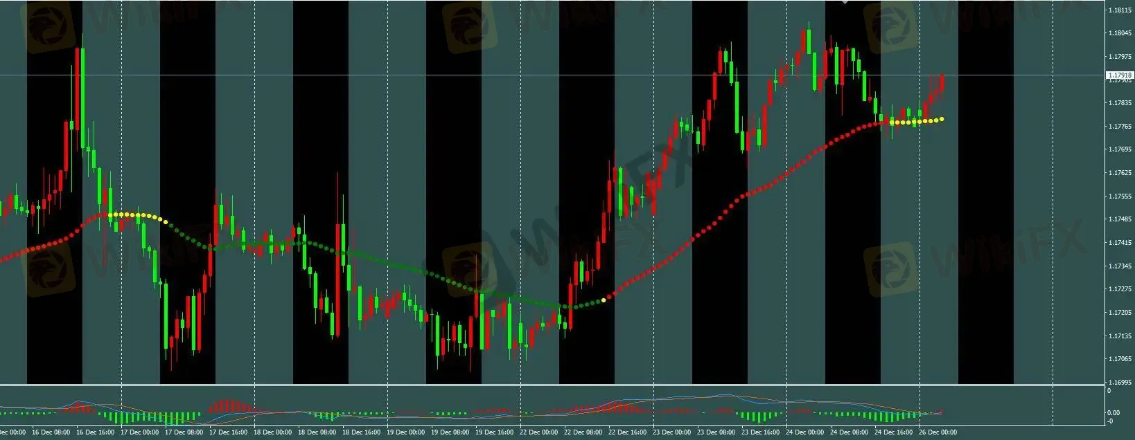 H1 三色线已由红转黄,已按模型在 1.1762 入场多单。保护性止损设于 1.1690,盈利目标为开仓价上方 50 点,趋势线转绿即平仓。
