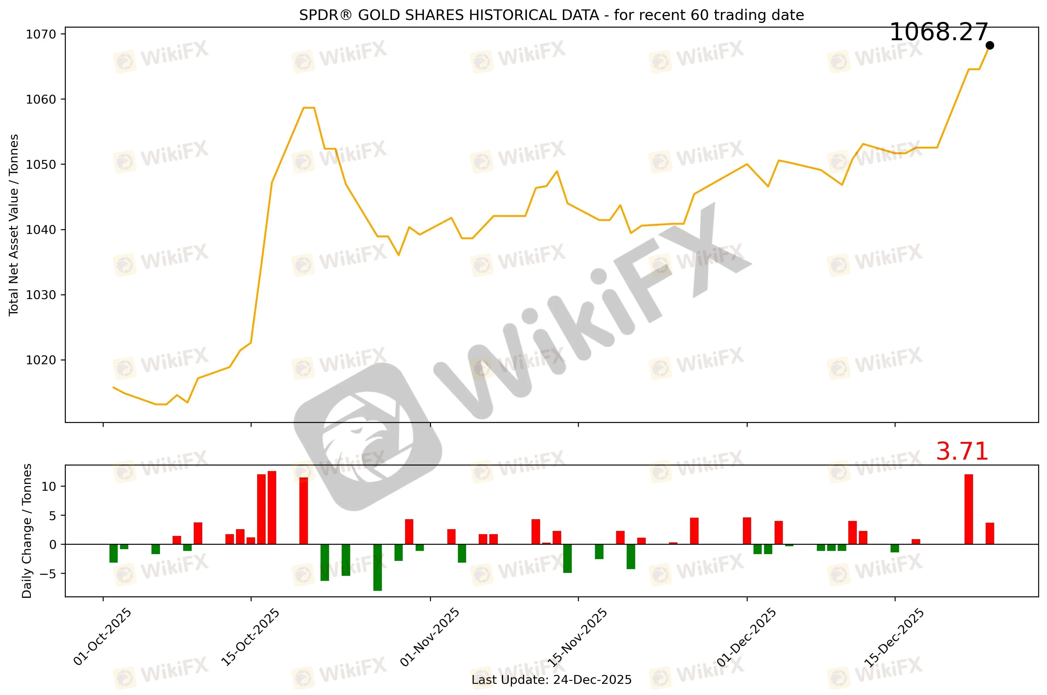 截至12月24日,全球最大的黄金ETF SPDR Gold Trust持仓量为1068.27吨,较上一个交易日增加3.71吨。12月24日现货黄金亚盘交易时间自4483.98美元/盎司开盘后延续前日涨势,震荡上行突破4500美元关口再创历史新高,最高向上触及4525.83美元/盎司,随后急跌回落至4475美元一线;随后全天震荡下行,最低向下触及4448.38美元/盎司,最终收于4479.39美元/盎司,跌5.95美元或0.13%。