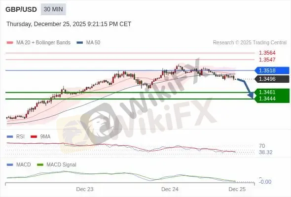 技术点评: RSI技术指标小于中性区域50。 MACD技术指标处在其信号线之下看空。 配置为负。 此外,价位低于其20天及50天移动平均线 ( 分别位于1.3508 和1.3510 )。