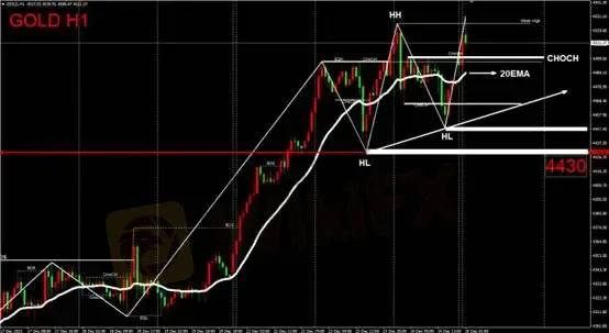 l 从一小时结构观察,多方在有效突破前波阻力位4501美元/盎司后,形成了向上的结构性转换(CHOCH)。这一破位是多头力量的确立,并进一步拓展了上涨趋势。当前,核心防守位在4430美元/盎司,次级多单订单区位于4448-4478美元/盎司,两者共同构筑了上行趋势线。价格持续持稳于20日均线(20EMA)上方运行,表明上涨惯性依然保持。