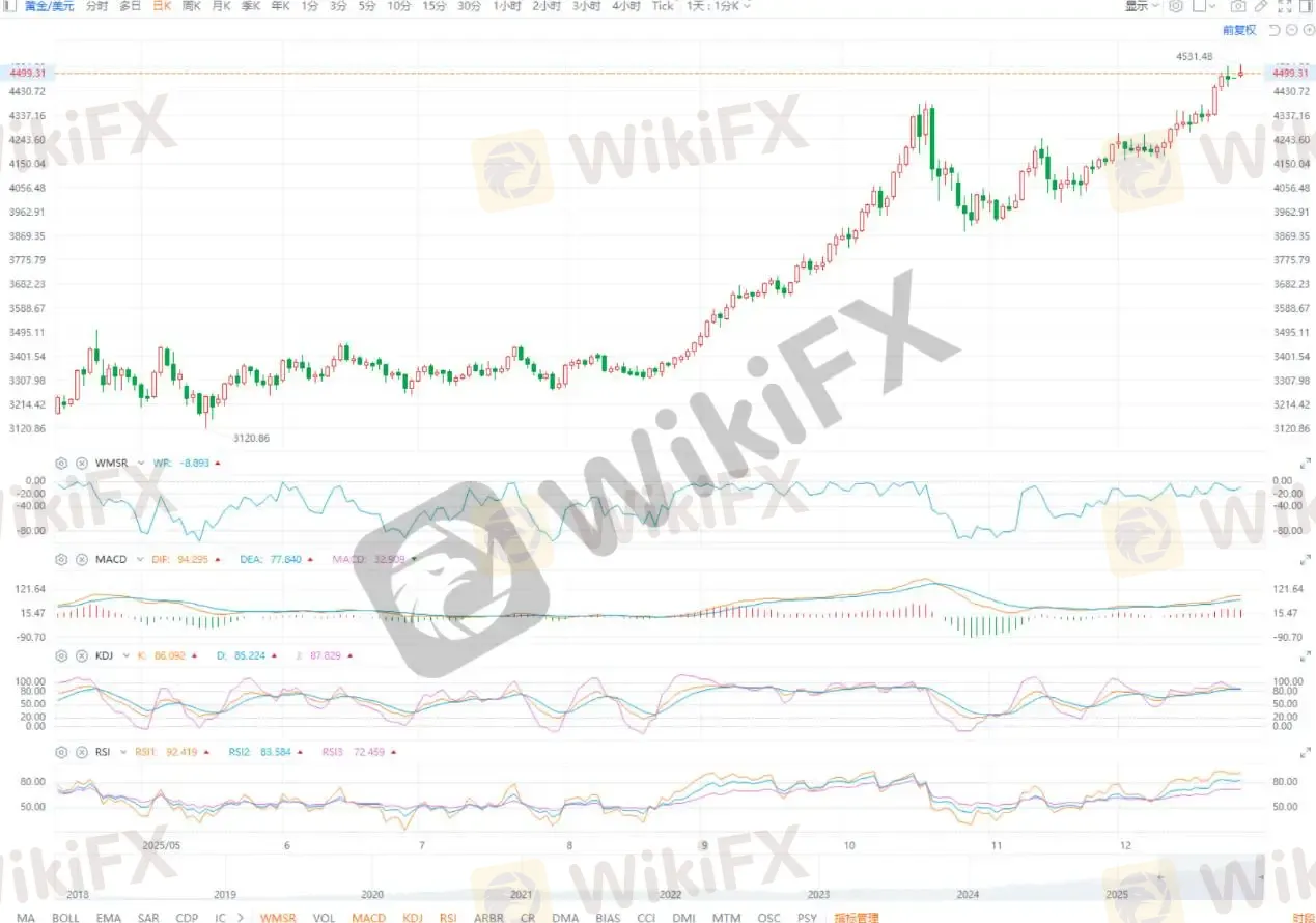 据 ETO Markets 市场监测显示,周四(12 月 25 日) 受圣诞假期影响,市场整体交投清淡,金价波动有限。周五(12 月 26 日) 亚市早盘,在地缘局势不确定性支撑下,现货黄金小幅走高,盘中上涨约 0.3%,一度升至 4493.63 美元/盎司,整体仍运行于历史高位区间。