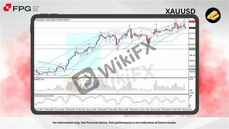 摘要:XAUUSD(黄金)H1 周期上,黄金此前经历了一轮快速且强劲的上涨行情,价格自 4338 一路拉升至 4498。随后,多头动能进一步延续,成功刷新历史新高,最高触及 4551 附近。在创下新高后,价格目前进入一轮健康的技术性回调阶段,现报约 4523。尽管短线有所回落,但整体市场结构依旧稳健,波动率维持在高位,多头偏向仍然占优,买盘持续在高位区间进行承接。技术面分析。从技术结构来看,XAUUSD