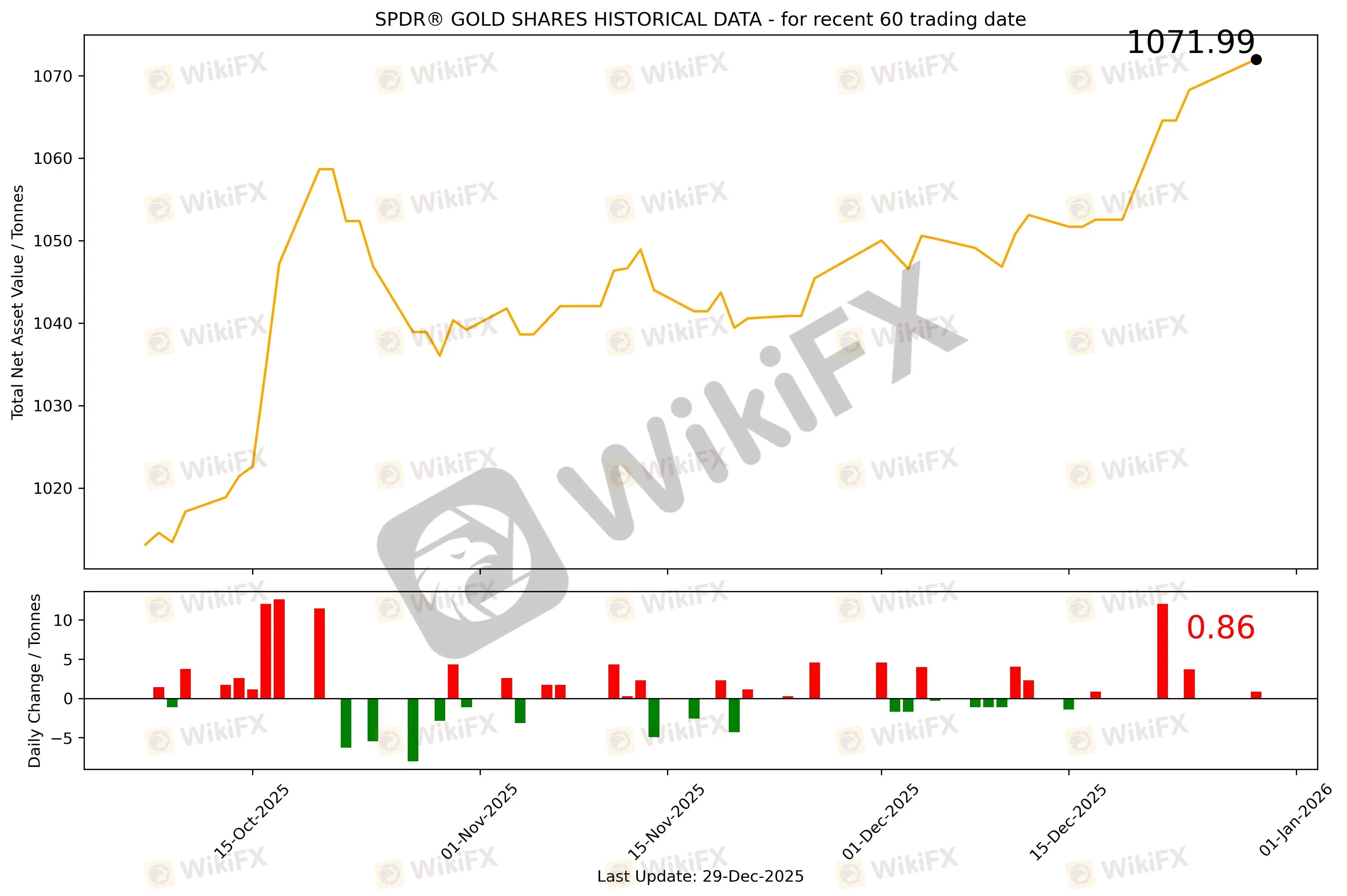 截至12月29日,全球最大的黄金ETF SPDR Gold Trust持仓量为1071.99吨,较上一个交易日增加0.86吨。12月29日现货黄金自4532.41美元/盎司开盘后先涨后跌,最高触及4550.52美元/盎司,未能有效站稳4550美元一线,随后全天震荡下行。美盘交易时间加速下行,最低向下触及4302.853美元/盎司,最终收于4331.71美元/盎司,跌200.7美元或4.43%。