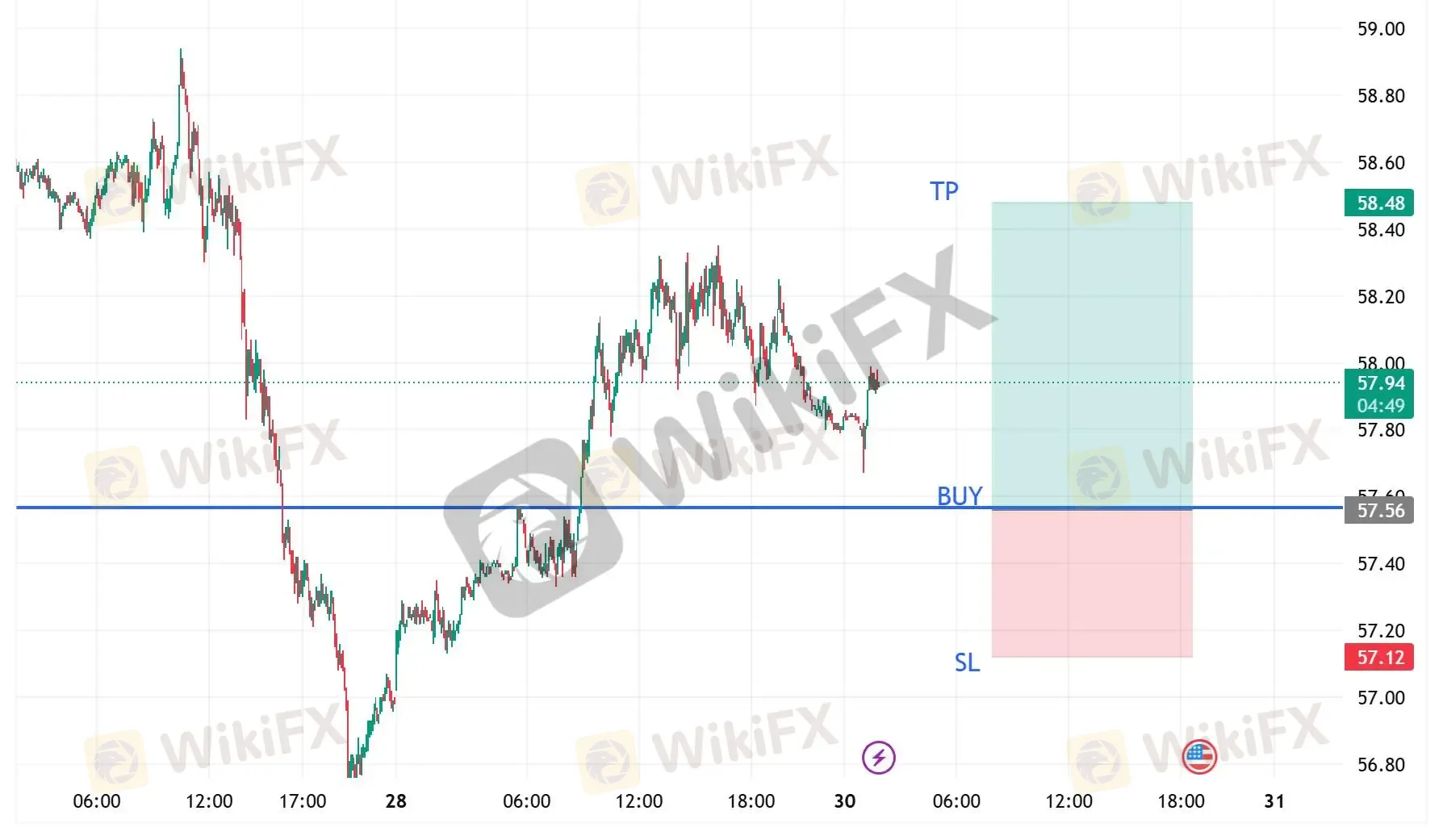 当日目标区间:57.5附近做多,带好止损。