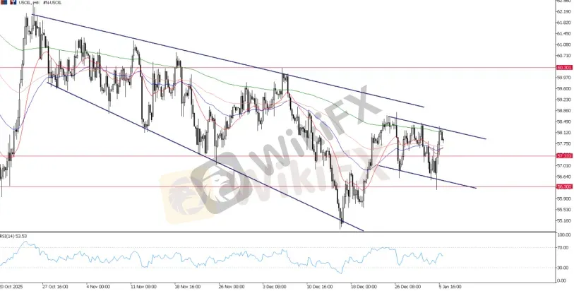技术面上,57.30支撑有效。若突破近期阻力通道58.00附近,可能打开向60.00的上行空间。