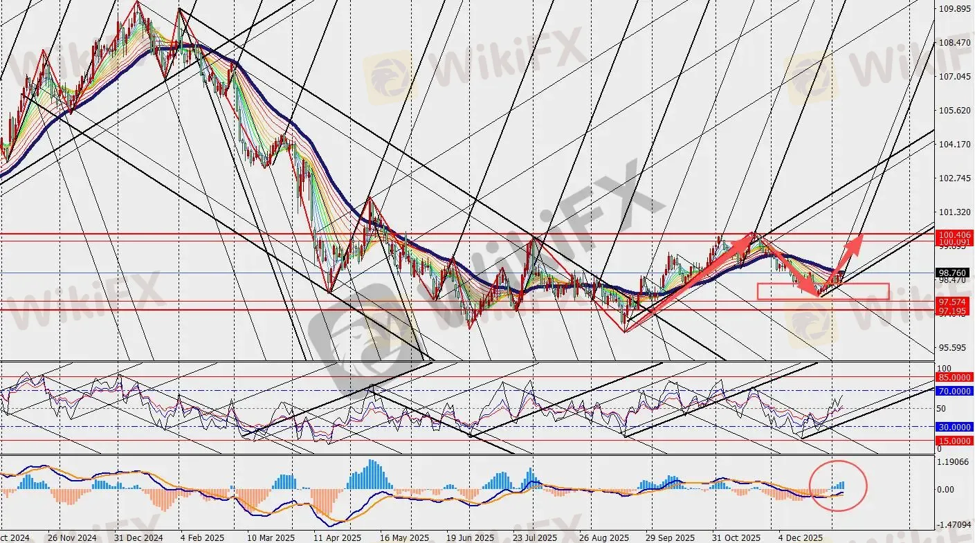 美元指数日线级别震荡反弹,MACD双线和量能柱进一步扩张。本周即将发布的数据将为美联储本月晚些时候的决策提供参考。其中最关键的是定于周五发布的政府月度非农就业报告,市场预计该报告将显示12月招聘温和增长,失业率略有下降。