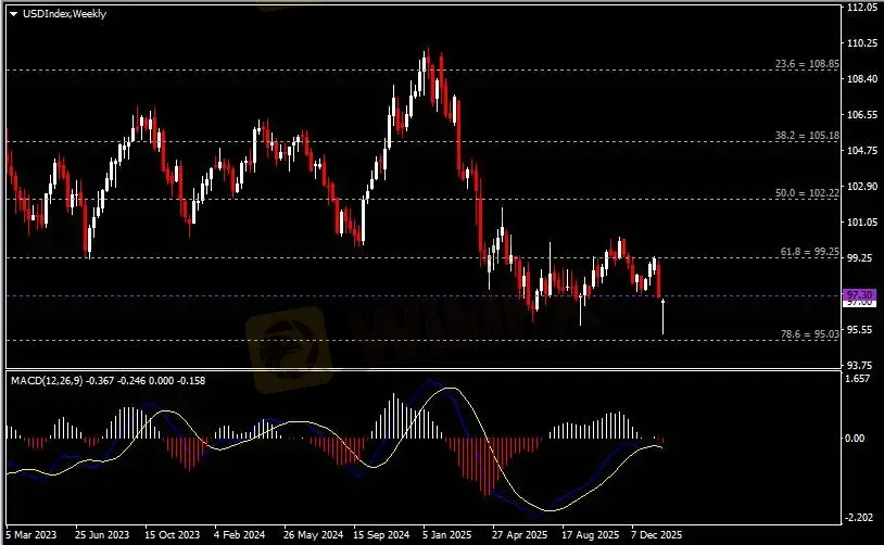 周线图显示美元指数低位反弹,当前逼近97.30阻力。从MACD来看,快慢线死叉依旧,红色动能柱温和放量。指数走势和动能柱的变化呈分歧。