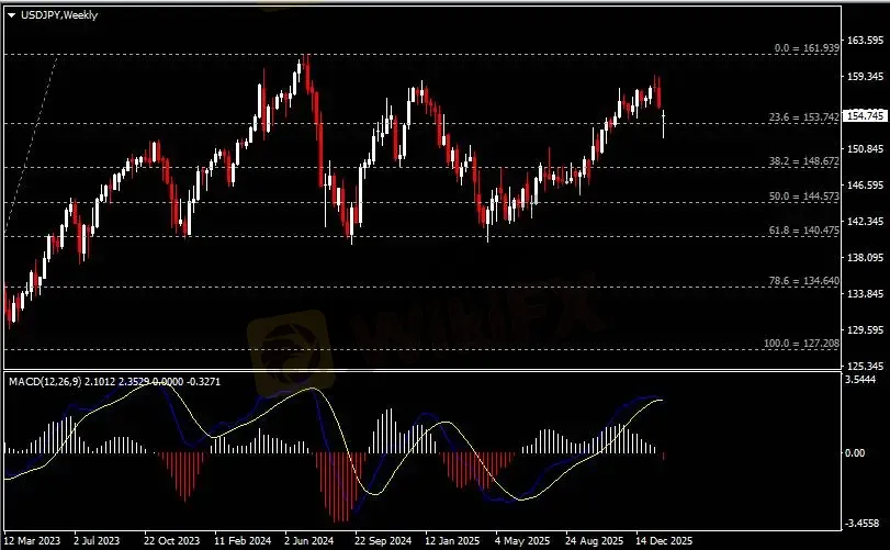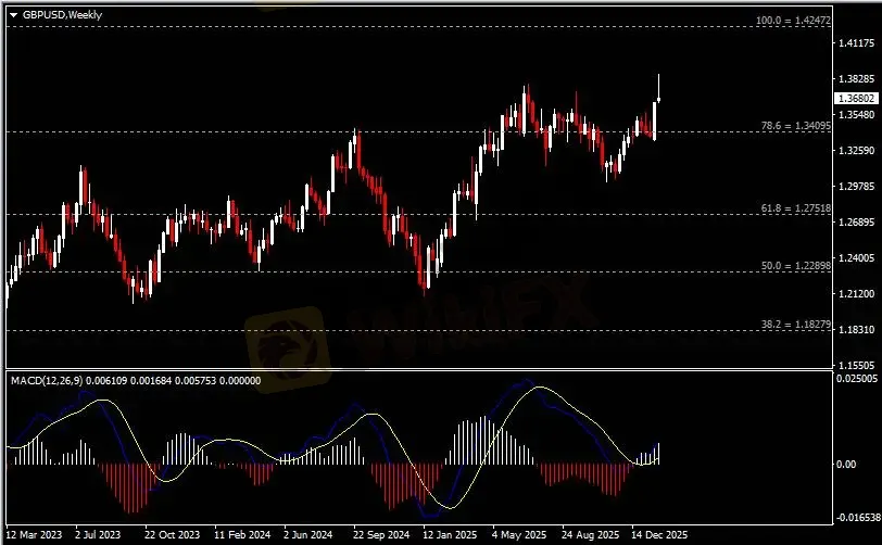 周线图显示美元兑日元持稳于153.70支撑。从MACD来看,快慢线形成死叉,白色动能柱收缩殆尽。汇价走势和动能柱的变化呈分歧。