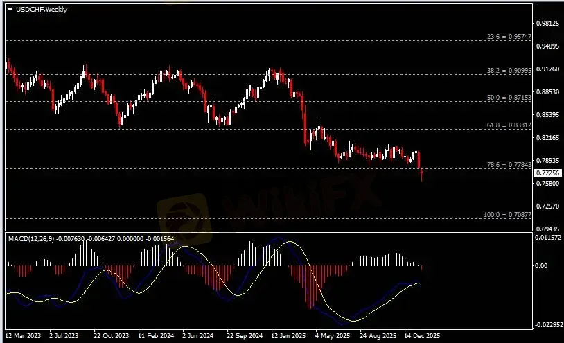 周线图显示美元兑瑞郎震荡下挫,当前收于前低0.7780。 从MACD来看,快慢线形成死叉,白色动能柱收缩殆尽。汇价走势基本和动能柱的变化一致。