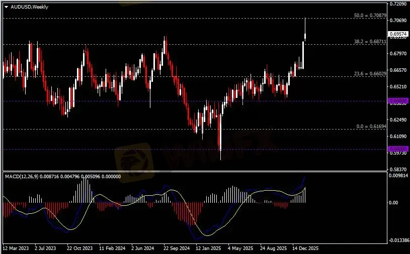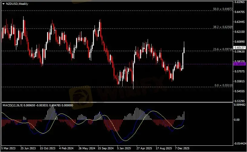 周线图显示纽元兑美元震荡上涨,当前收于前高0.5970。从MACD来看,快慢线拐向上行,白色动能柱温和放量。汇价走势基本和动能柱的变化一致。
