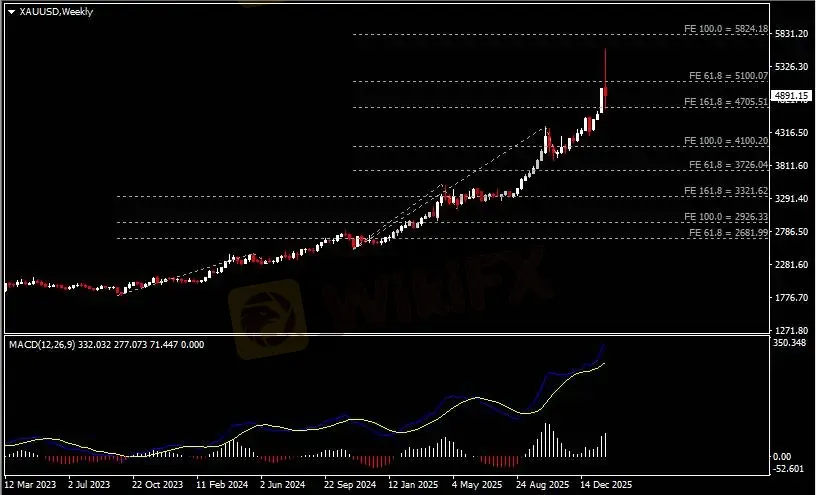 周线图显示金价先涨后跌,当前承压于5100关键阻力。从MACD来看,快慢线向上扩张,白色动能柱温和放量。金价走势和动能柱的变化呈分歧。