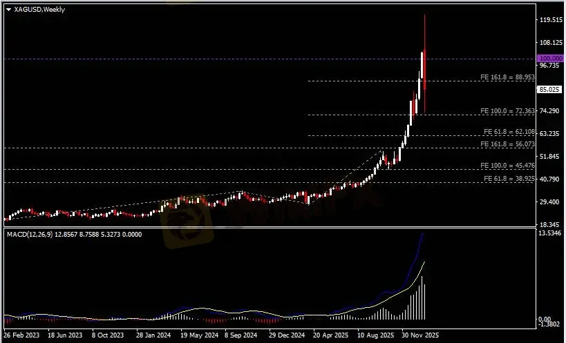 周线图显示银价遭遇空头抛售,当前承压于前低89.0。从MACD来看,快慢线向上扩张,白色动能柱则温和收缩。银价走势基本和动能柱的变化一致。