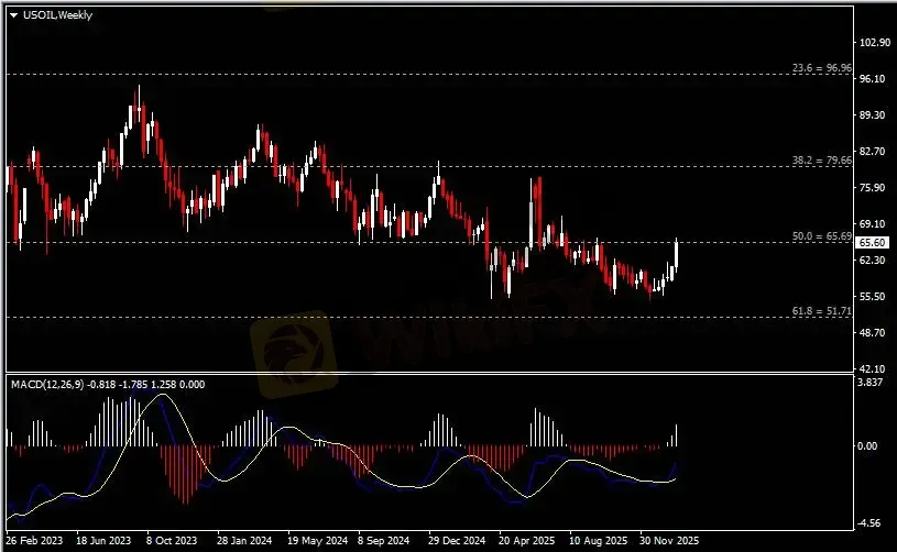 周线图显示油价震荡上涨,当前测试65.70阻力。从MACD来看,快慢线拐向上行,白色动能柱温和放量。油价走势基本和动能柱的变化一致。