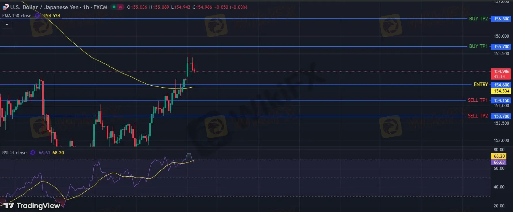 在 154.60 下,看空,目标价位定在 154.15 ,然后为 153.70。