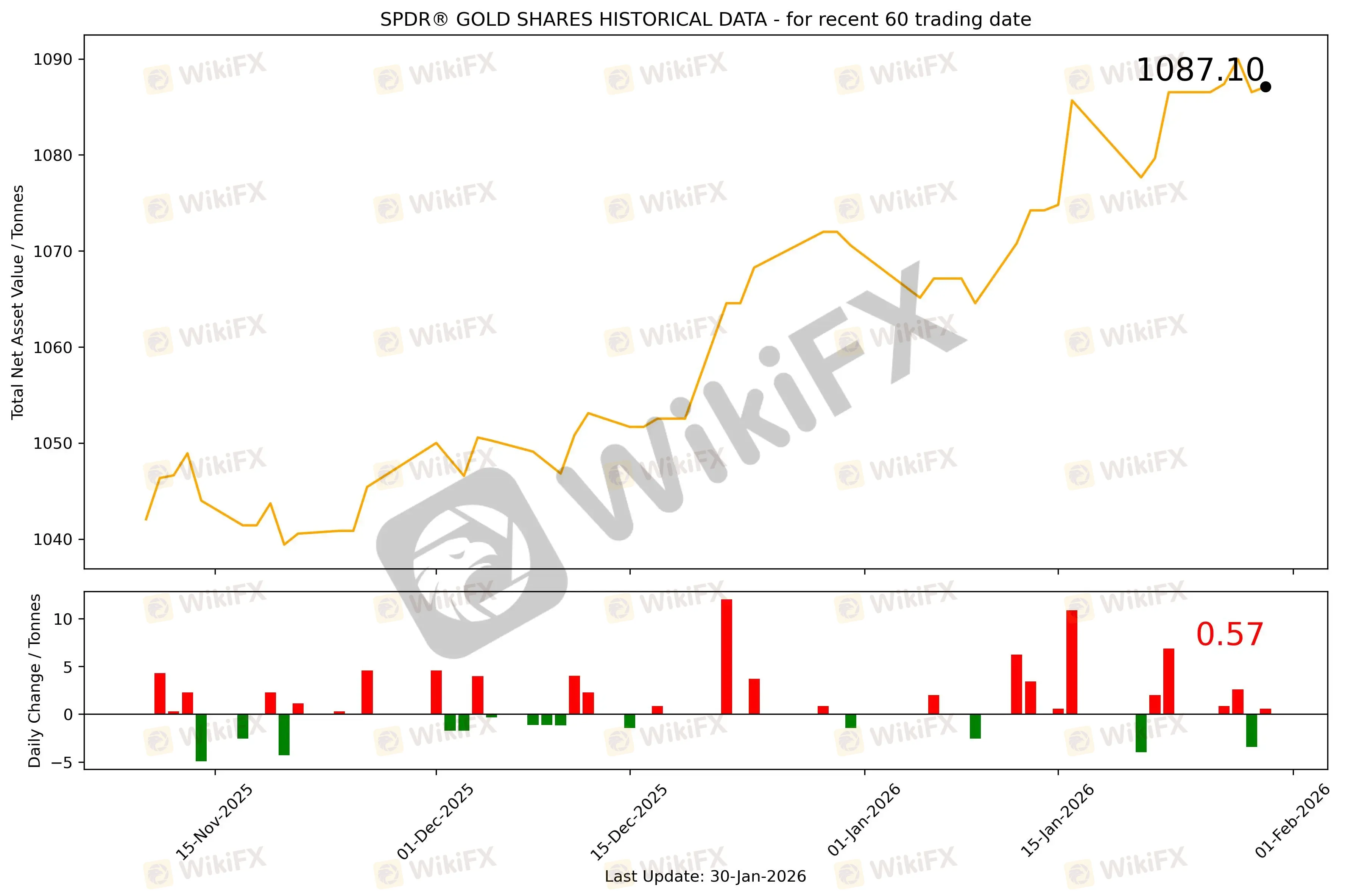 截至2026年1月30日,全球最大的黄金ETF SPDR Gold Trust持仓量为1087.10吨,较上一个交易日增加0.57吨。2026年1月30日现货黄金自5384.71美元/盎司开盘后宽幅震荡下行,盘中最低向下触及4682.908美元/盎司,创近40年最大单日跌幅。最终收于4895.118美元/盎司,跌484.232美元或9.00%。