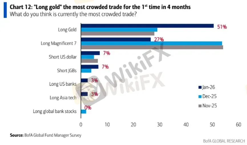 (图三、做多黄金超过半数经理人认为是拥挤交易;资料来源:BofA)