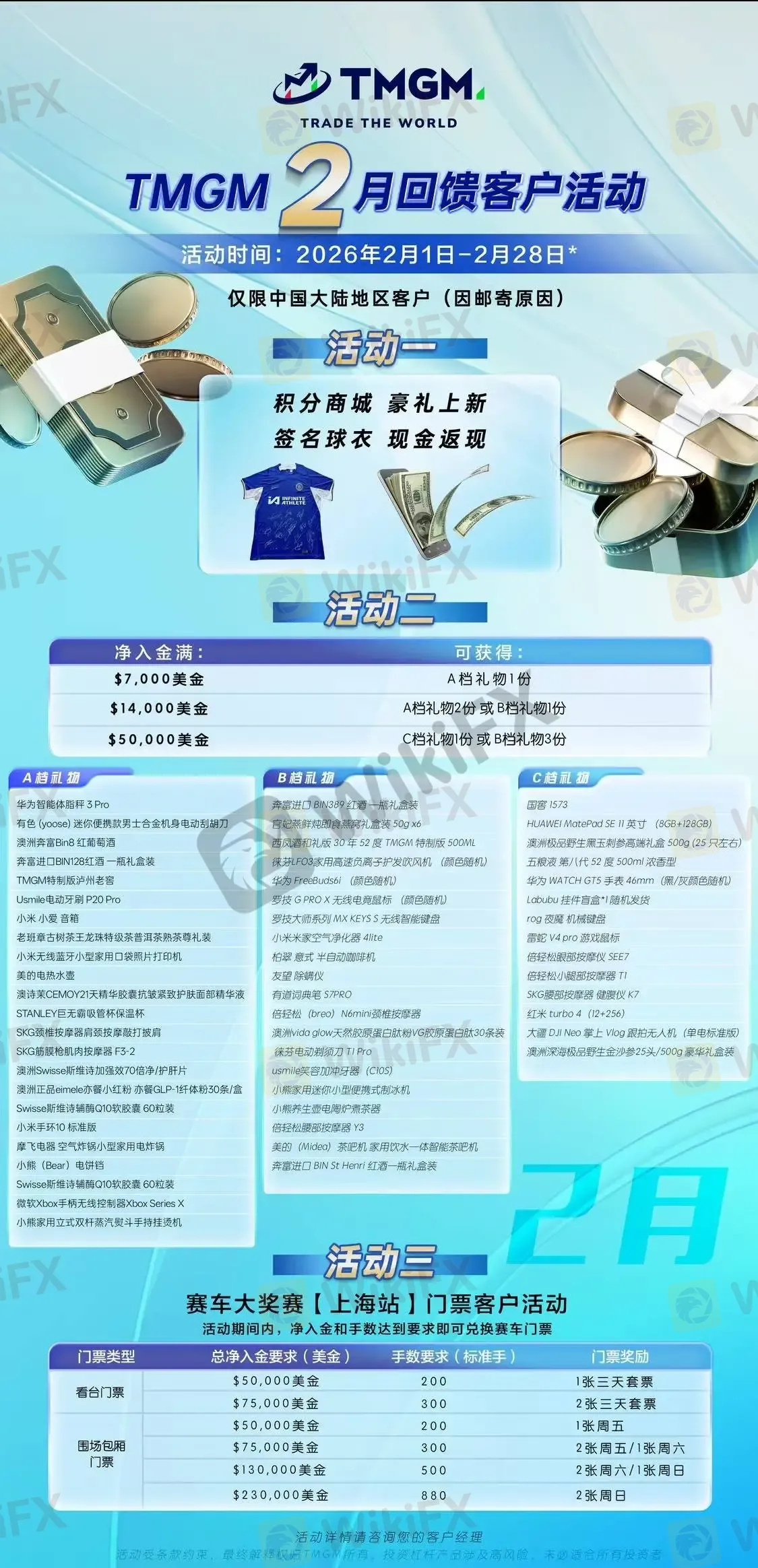 2026年02月01日 – 2026年02月28日之间,前 100 名净入金 $7,000 美金或以上的客户即可参与活动申请!净入金$7000美金及以上,即可在A档好礼中任意挑一件礼物; 净入金$14,000美金及以上,即可在A档好礼中任意挑选两件礼物,或在B档好礼中任意挑选一件; 净入金$50,000美金及以上,即可在B档好礼中任意挑选三件礼物,或在C档好礼中任意挑选一件!(下图活动二)