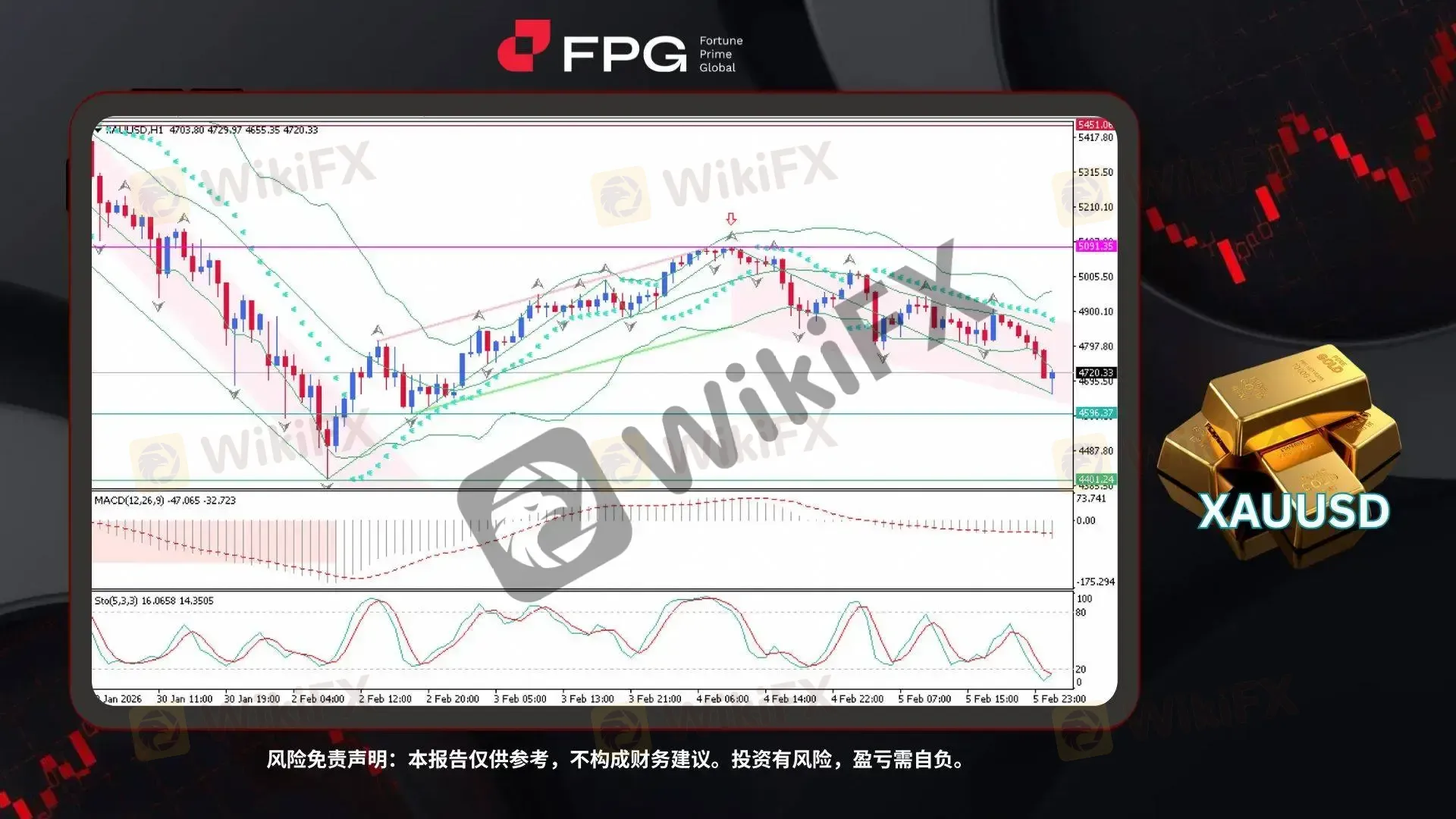 在 H1(1小时) 时间框架上,XAUUSD 此前经历了一段较长时间的下跌行情,价格一路走低至 4401 区域。随后金价出现强劲反弹,迅速拉升至 5091 一线。然而,该轮反弹未能延续动能,金价在该阻力区域遭遇强烈抛压,触发趋势反转,并形成清晰的 倒V型结构。目前,XAUUSD 交投于 4720 附近,仍运行于空头通道内,且整体波动率维持在相对较高水平。