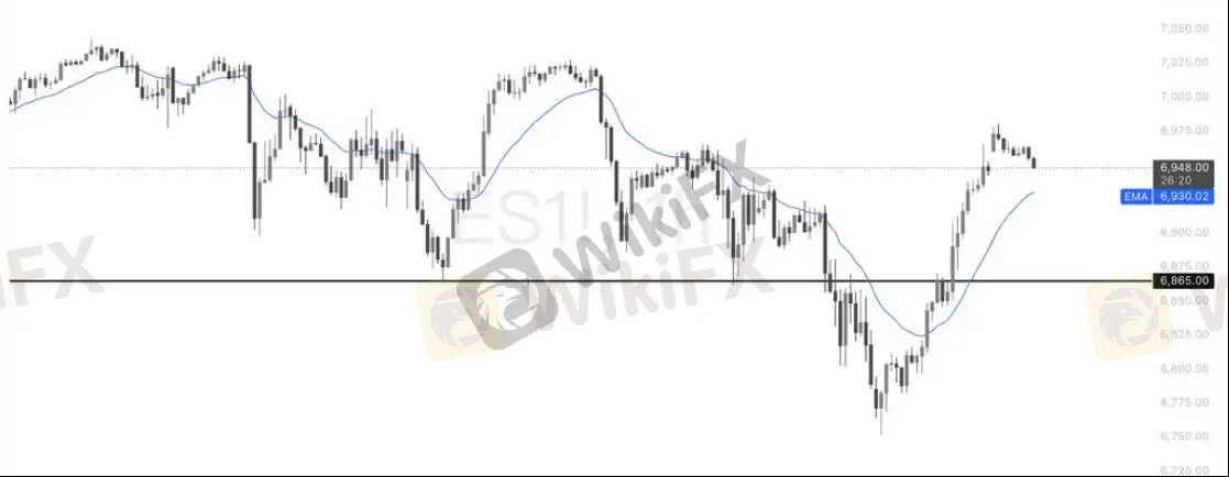 标普期货自 6865 支撑反弹后持续走高,目前运行在 EMA 上方,短线动能明显修复。价格正逼近前期结构压力区域,若进一步站稳并突破,上方空间有望继续打开;若受阻回落,需关注第一支撑位6930(20日均线附近),若跌破关注 6865 一线支撑得失,跌破则可能重新转弱。