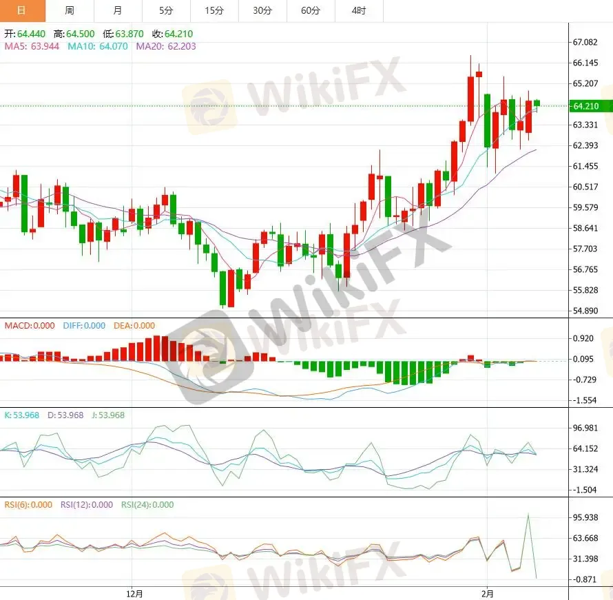 在下行方向, 63.50 美元附近构成短线重要支撑, 该区域多次限制油价回落空间。 若跌破该位置, 油价或重新测试 62.00 美元一线, 该区域既是前期震荡区间下沿, 也是情绪关键防守位。 上行方面, 65.00 美元为首个关键阻力区域, 若有效突破, 油价有望进一步向 66.80 — 67.50 美元区间推进。 但在供应过剩预期未明显改善之前, 油价上行空间仍可能受到限制。