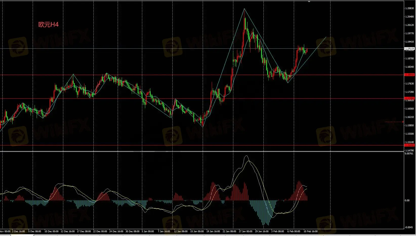 欧元H4价格回落至1.18附近后,震荡拉升至1.19,持续回到多头态势。