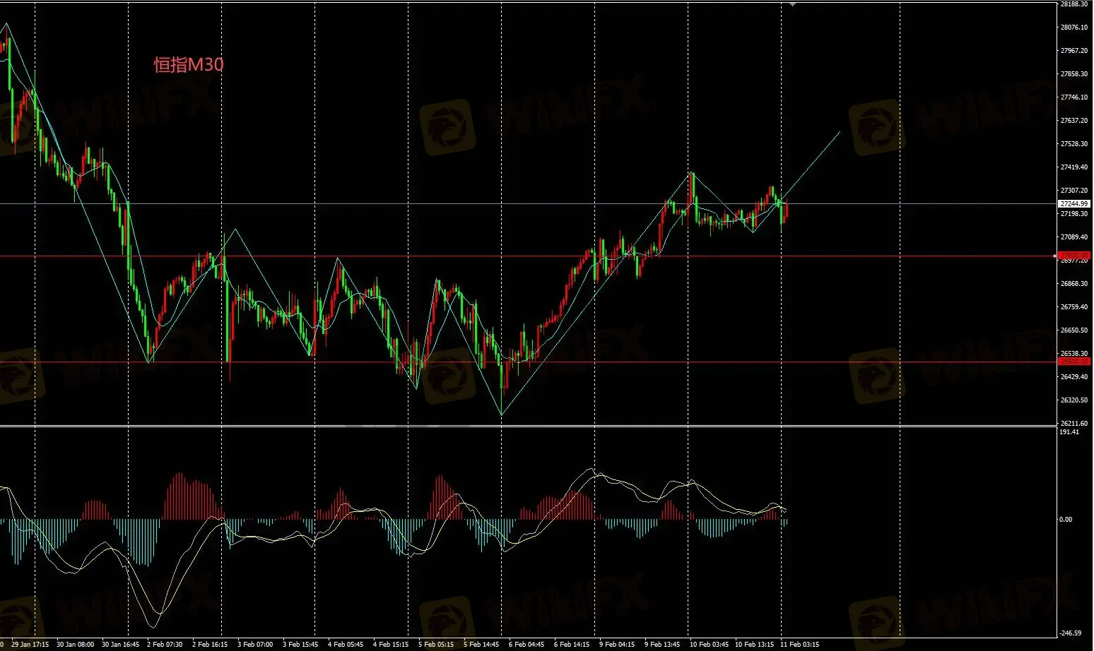 恒指M30多头走势,下方支撑位27000;只要坚守该位置则空头暂时搁置。