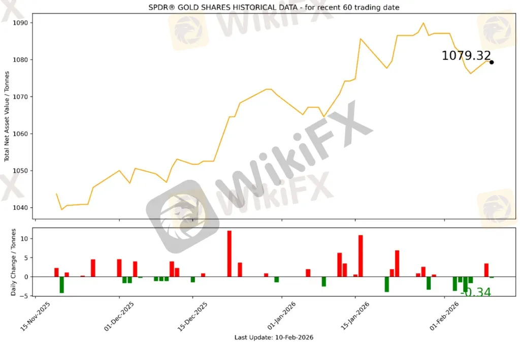 截至2026年2月10日,全球最大的黄金ETF SPDR Gold Trust持仓量为1079.32吨,较上一个交易日减少0.34吨。2026年2月10日现货黄金自5067.09美元/盎司开盘后暴跌八十美金至当日低点4987.67美元/盎司,随后迅速拉回。亚盘和欧盘时间在5013-5056美元/盎司宽幅震荡,美盘交易时间盘中最高向上触及5078.67美元/盎司,后快速回落至5000美元关口低位震荡。最终收于5023.88美元/盎司,跌34.93美元或0.69%。
