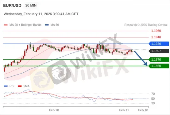 欧元/美元在1.1900附近高位窄幅整理,过去三个交易日累计上涨超1%,市场多头情绪回暖,核心驱动是非农前对美元走弱与美联储更偏宽松的预期升温:市场预计今夜非农新增约7万人、失业率4.4%,若数据不及预期将强化“就业放缓仍在”的判断并推升降息定价(当前对3月按兵不动概率仍高,但对后续维持不变的把握已下降)。相对而言,欧洲央行被定价为更偏中性、3月维持利率不变概率较高,令美欧“政策差”继续为欧元提供支撑。
