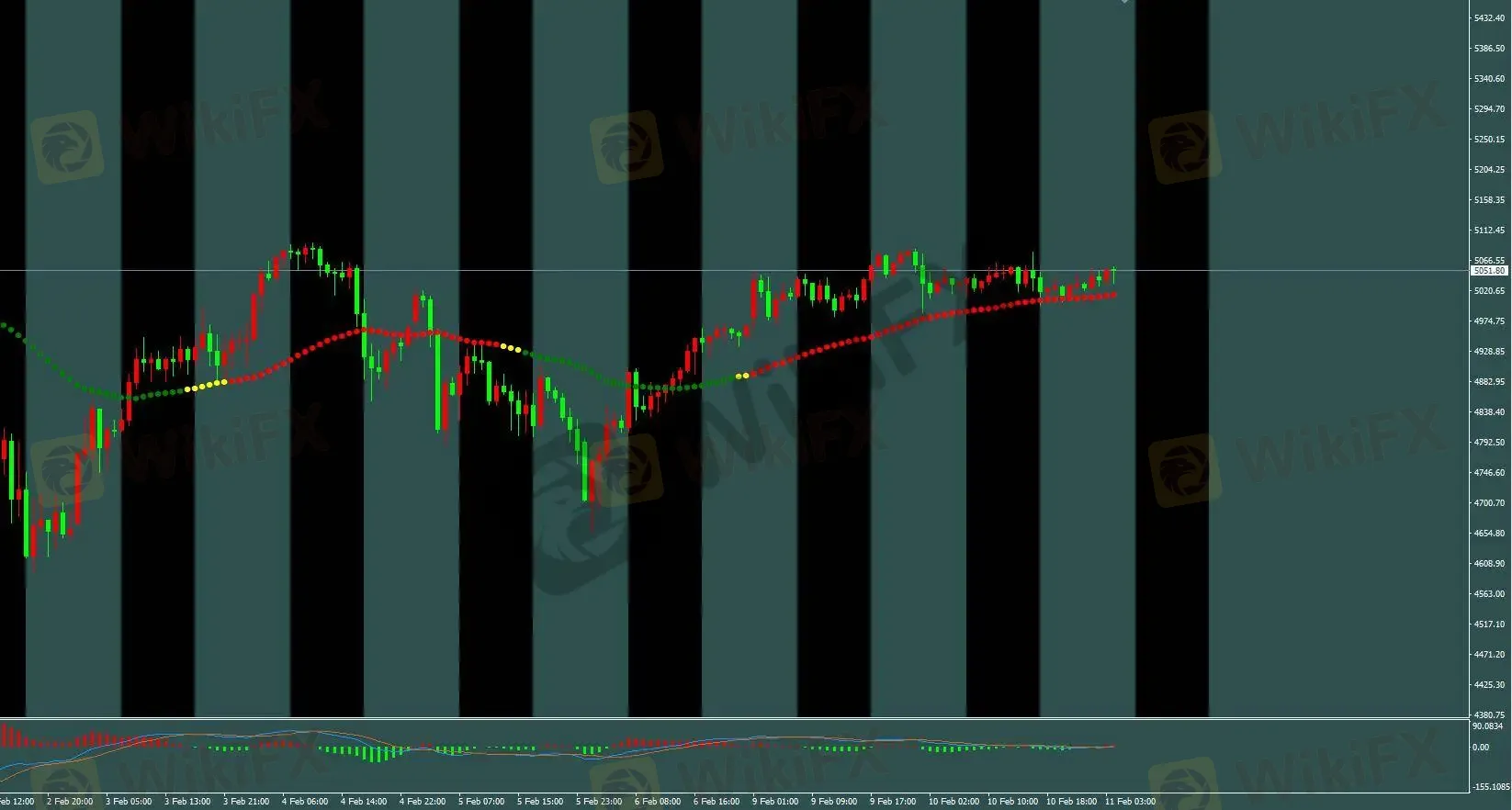 三色线系统 H1 周期维持红色。H1 标准多单已于 5006 附近进场并盈利约 200 点离场。日内交易可结合 M5 基础模型进行短线操作。