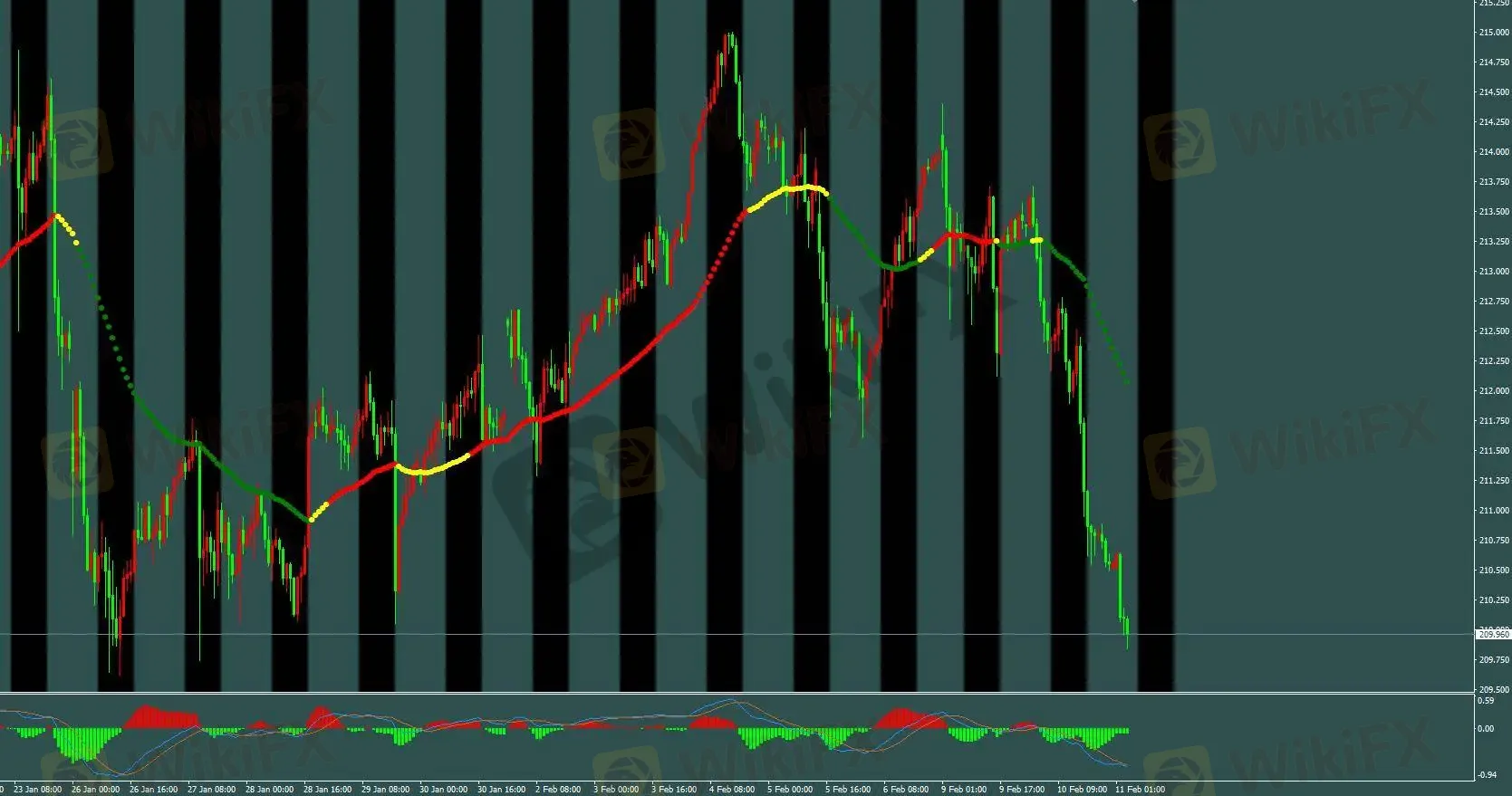 三色线系统 H1 周期已由黄色转为绿色。H1 标准空单已于 213.2 附近进场并盈利 70 点离场。日内建议根据 M5 基础运用模型进行操作。