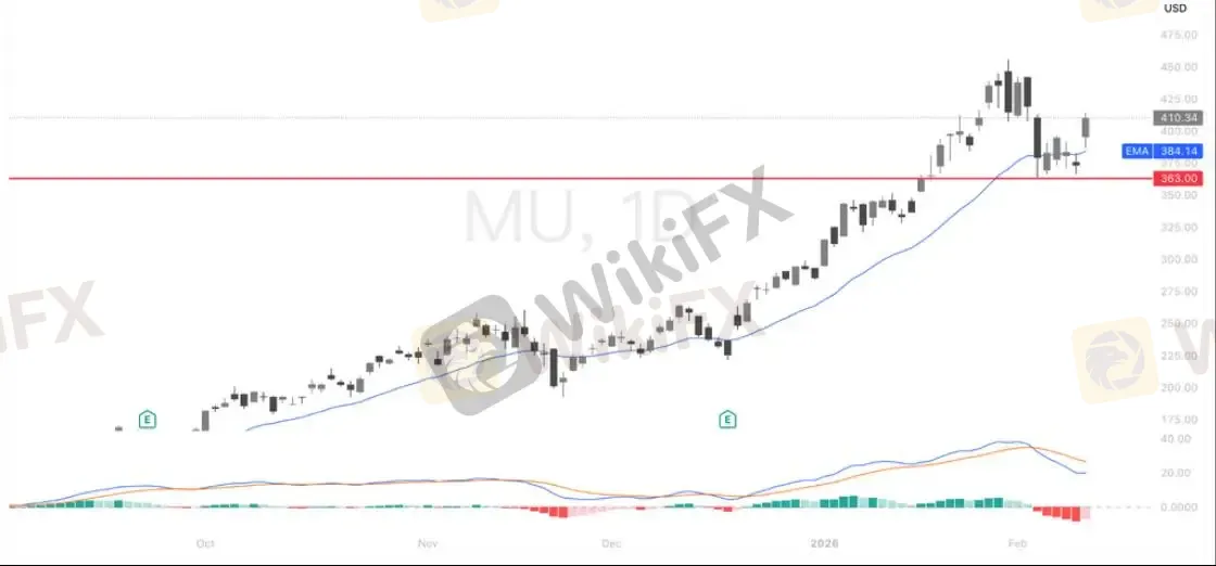 从技术结构看,存储板块整体趋势依然强劲,MU在回踩363关键支撑后快速获得买盘承接并重新走强,价格持续运行于中期EMA上方,多头趋势未被破坏,本轮回调更像上涨过程中的节奏修正而非趋势反转。基本面与技术面形成共振,多家机构同步上调目标价:德意志银行维持“买入”并将目标价上调至500美元,摩根士丹利上调至450美元,市场最高目标价已上看600美元。在供需持续偏紧与AI存储需求扩张背景下,中期结构仍偏多。