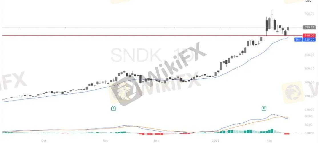 从技术结构看,SNDK仍处于清晰上升趋势中,股价过去一年累计上涨超1500%,并始终运行在20/50/200日均线之上,显示强劲多头动能。此前快速拉升后进入高位震荡,属于强趋势中的正常消化阶段;当前价格回踩540关键支撑未破并出现强势反弹,说明资金承接依旧稳固。若后续重新突破600上方压力区,趋势有望进一步延续;只要守住540,中期多头结构仍保持完整。