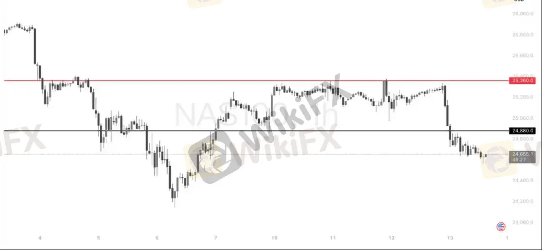 从结构来看,NAS100 在 25,360 关键压力位下方多次受阻,未能形成有效突破,随后价格快速跌破 24,880 重要中枢支撑,短线结构由震荡转为空头主导。当前价格运行于前期区间下沿附近,动能明显转弱,市场进入趋势验证阶段。