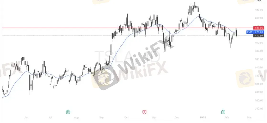 特斯拉此前反弹触及 436 关键阻力后未能突破,随即回落并重新跌回20日均线下方,显示上方供给压力明显,反弹动能不足。均线由支撑转为压制,短线趋势重新偏空,行情进入弱势震荡阶段。