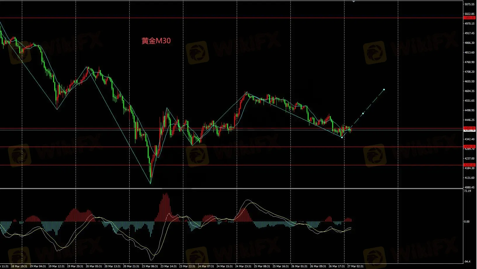 M30图表金价日内逢低买入操作,下方重要支撑位4400,目标4500和4600。