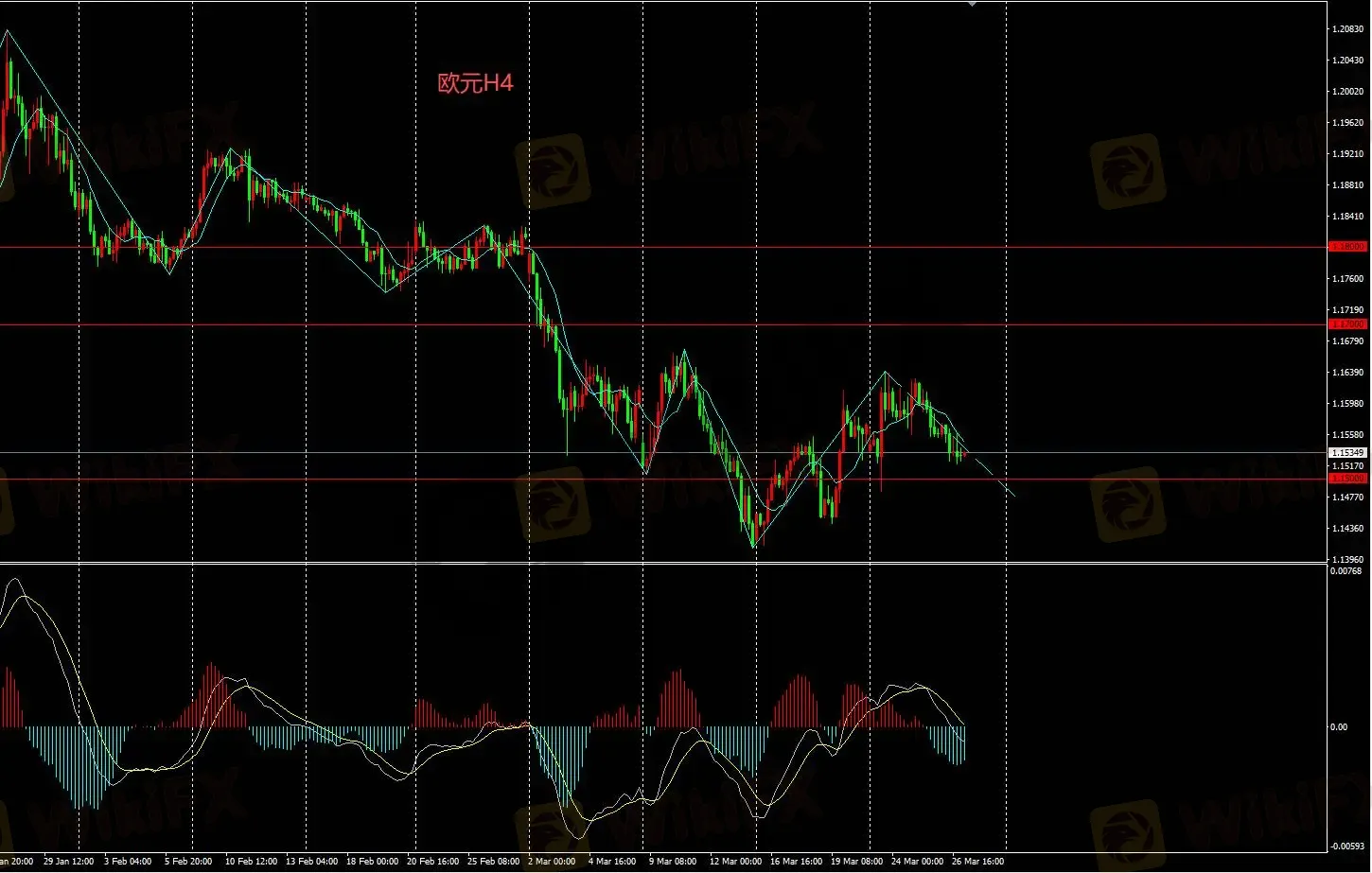 欧元H4价格受阻于1.16持续回落,当前走势仍为空头走势,长期仍然看空。
