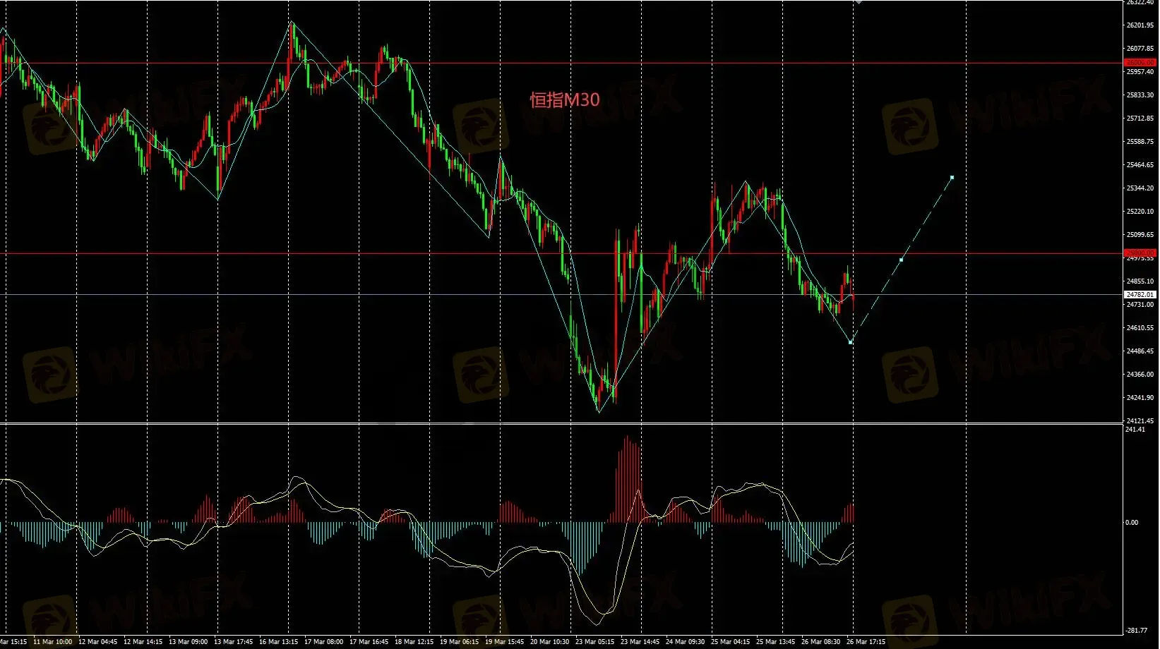 恒指M30持续看空,日内逢高卖出操作,上方重要关口25000,目标24000。