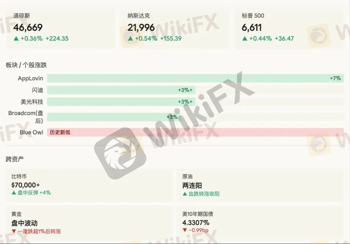 周五市场上演“闪跌后修复”剧本——特朗普对伊朗设下4月7日最终期限、扬言打击民用基础设施,指数盘中一度急跌;随后他释放谈判信号,恐慌情绪迅速平息,三大指数翻红收涨。芯片板块四连胜,AI应用AppLovin独领风骚;Broadcom与谷歌签约至2031年,盘后再涨3%。另类资产端出现裂缝,Blue Owl股价创历史新低,高盛、Barings旗下私募信贷基金赎回压力骤升,流动性风险值得警惕。比特币盘中强势突破7万美元,加密资产跑赢传统风险资产。
