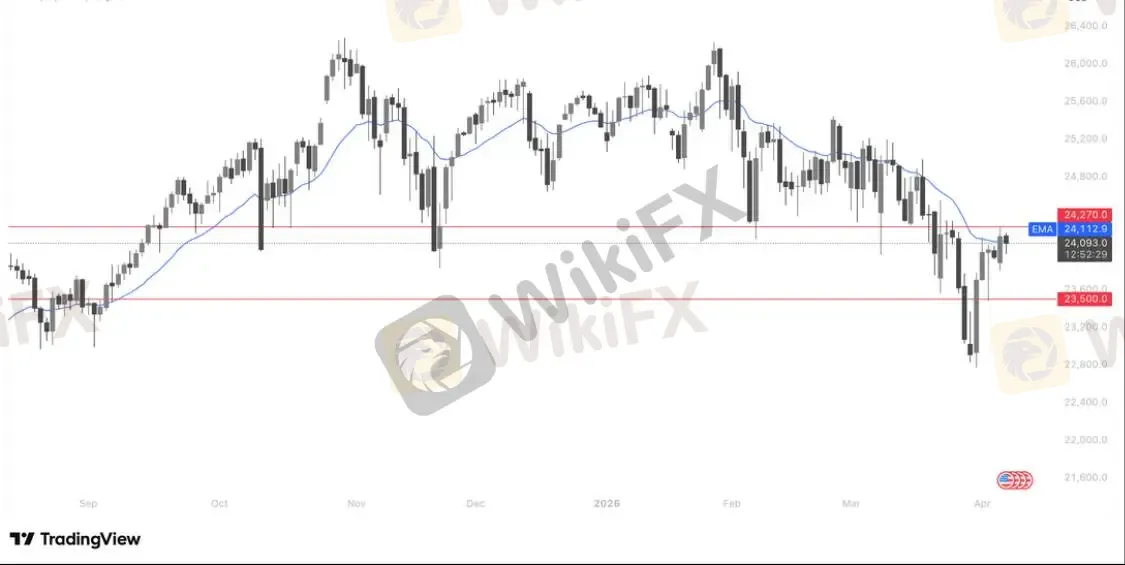 当前价格运行在EMA20下方,整体结构偏弱,反弹动能不足。上方24,200一线已转为短期压力位,多次反弹未能有效突破,显示空头仍占主导。下方23,500构成阶段性支撑,一旦失守,或将打开进一步下行空间。从节奏来看,市场仍处于震荡下行通道中,短期更倾向于反弹做空思路,需等待放量突破均线压制后,才可能迎来结构性修复。