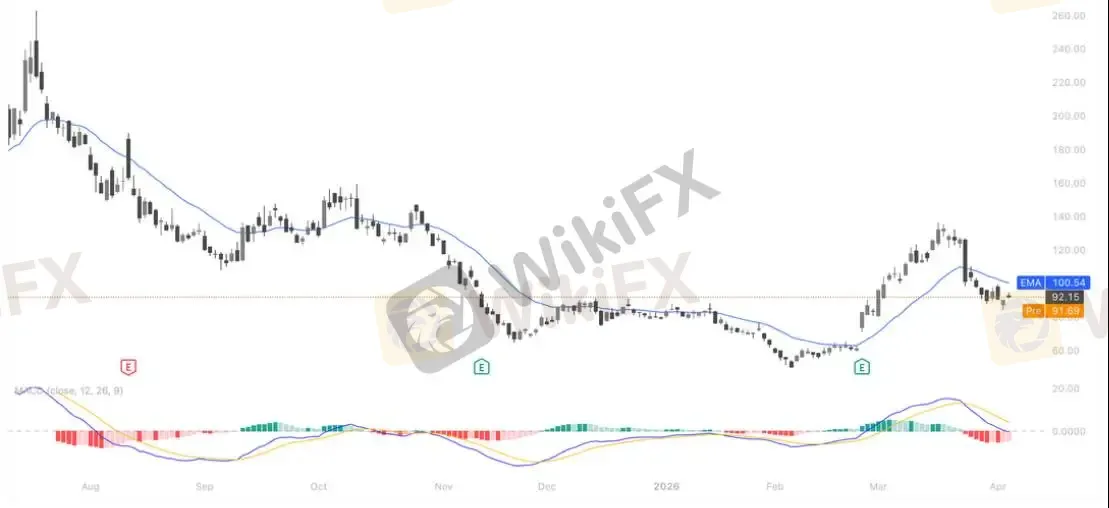 技术面来看,价格在经历了一段显著的反弹后,目前正处于回踩确认的关键阶段。股价在 3 月份放量突破了长期的底部盘整区间,但近期受阻于前高阻力,回落至 20 日均线 (EMA 100.54) 下方寻找支撑。目前的焦点在于 $92 附近的平台位能否止跌收稳;下方的 MACD 指标已经出现死叉且红柱增长,暗示短期调整压力尚未完全释放。若能在此区域企稳并伴随能量萎缩,则有望构建“底分型”确认回补缺口后的二次起航,否则需警惕行情转为更深度的区间震荡。