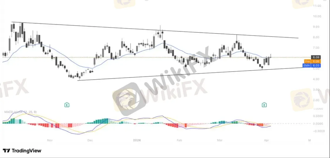 POET日线图显示价格正处于一个长期的收敛三角形(楔形)震荡区间内,目前重心缓慢上移。股价在触及下轨支撑后小幅反弹,现已站上 20 日均线 (EMA 6.03),呈现出企稳迹象。底部的 MACD 指标在零轴下方即将形成金叉(快线上穿慢线),短期有向上挑战三角形上轨(约 $8.00 附近)的潜力。当前的交易逻辑属于典型的区间内防御性反弹,在未放量突破上方趋势线之前,仍需以低吸高抛的震荡思维对待。