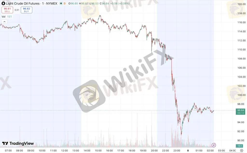 技术面上,日线结构显示油价在经历快速拉升后进入高位震荡阶段,目前已回落至关键支撑区域附近。下方 90 美元为重要支撑位,若有效跌破,可能引发趋势性抛售,进一步打开下行空间;上方阻力则集中在 108 美元区域,该位置此前多次压制价格反弹。从动能角度看,上涨动能明显减弱,市场进入情绪释放后的再平衡阶段。从 4 小时周期观察,价格短线呈现加速下跌后的技术性整理格局,若反弹未能突破 108 美元,则仍偏向弱势震荡;一旦重新站稳该水平,则可能再次测试此前 116 美元高点压力区域。