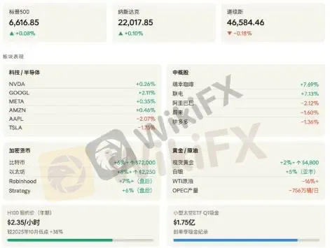 受地缘政治重大转机与货币政策预期转向的双重利好刺激,美股盘前呈现极强的风险偏好(Risk-on)特征,科技成长股与数字资产板块领涨大盘。